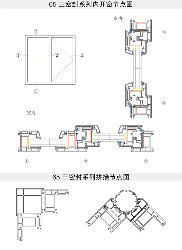 型材斷面設計合理 1、65系列主型材采用四腔結構,設有獨立排水腔、增強型鋼腔、保溫隔音腔,使熱傳導K值在2.0以下。 2、合理的斷面設計相應增大了X軸慣性距,使負荷性能明顯提高。 3、斷面的三道密封設計,使窗的氣密性、水密性、隔音性大大提高,完全滿足嚴寒地區用戶需求。